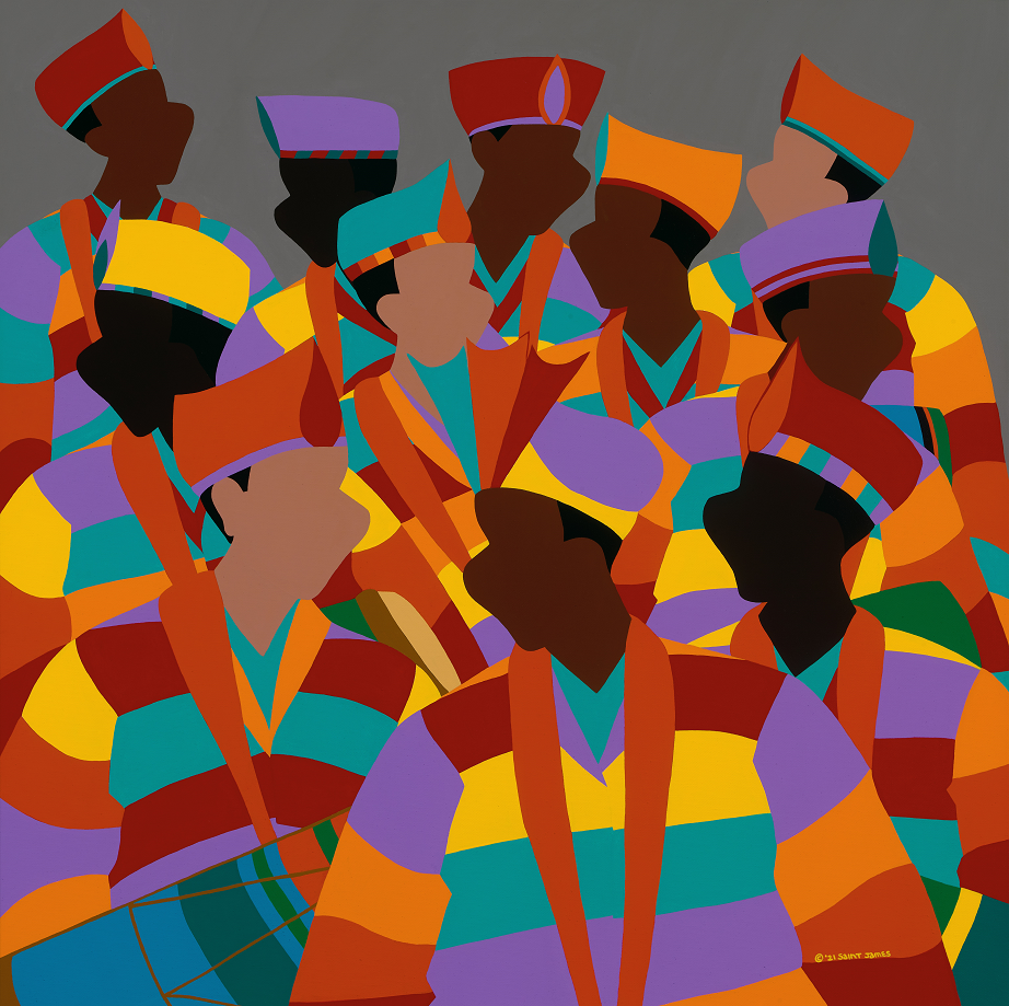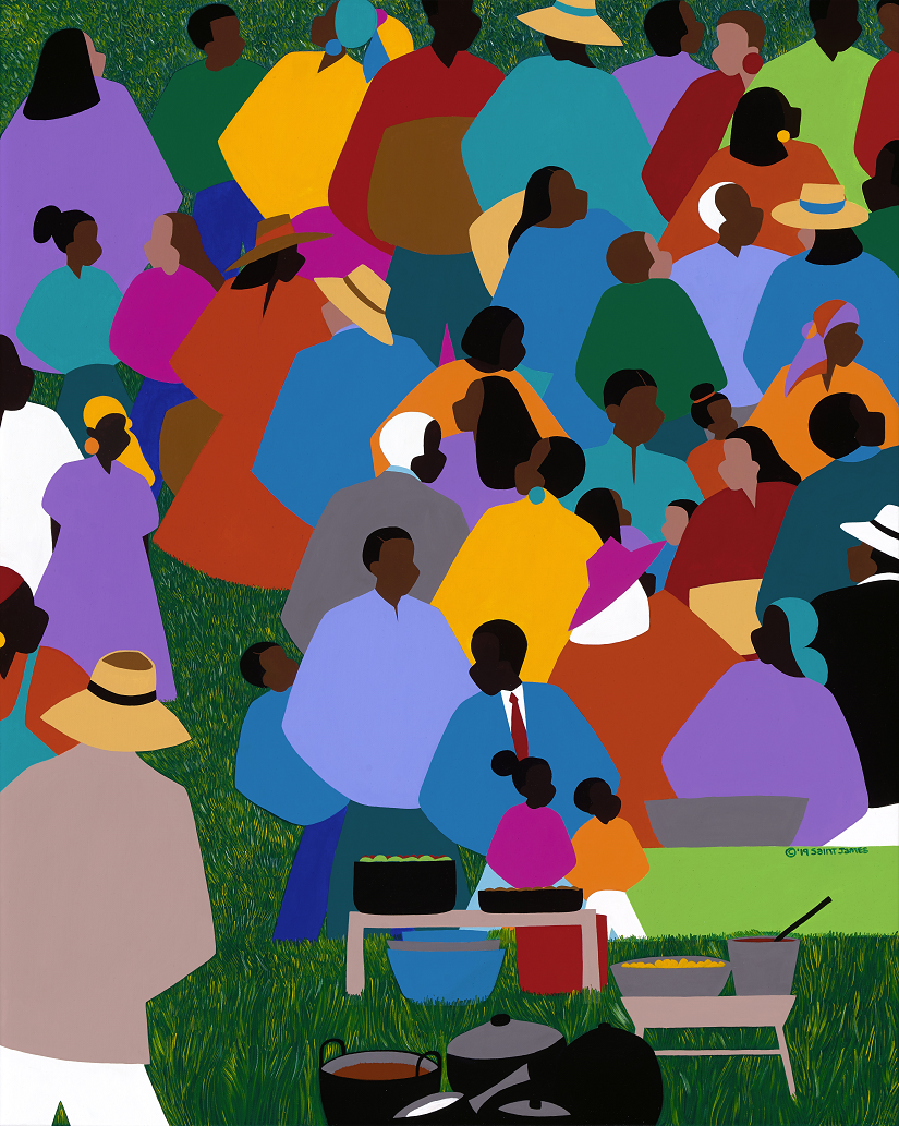 Known for her bold and colorful style, St. James’ artwork has appeared on the covers of many books, including works by Alice Walker, Terry McMillan and Julia Boyd. In 1997, she was chosen by the United States Postal Service to create the first Kwanzaa stamp.